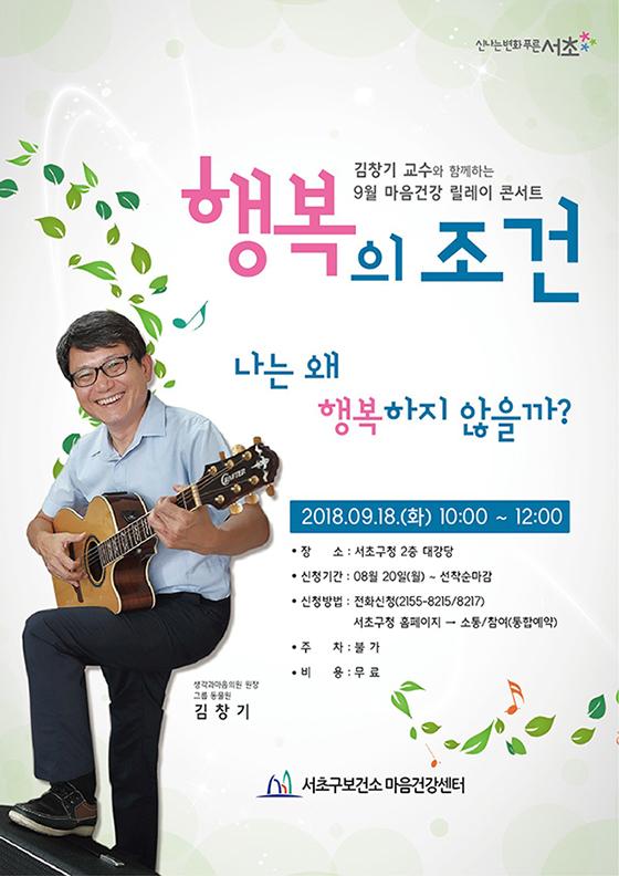 2018년 9월 18일(화) 서초구청 2층 대강당에서 진행한 김창기 교수와 함께하는 9월 마음건강 릴레이 콘서트 '행복의 조건 : 나는 왜 행복하지 않을까?' 공연 포스터임